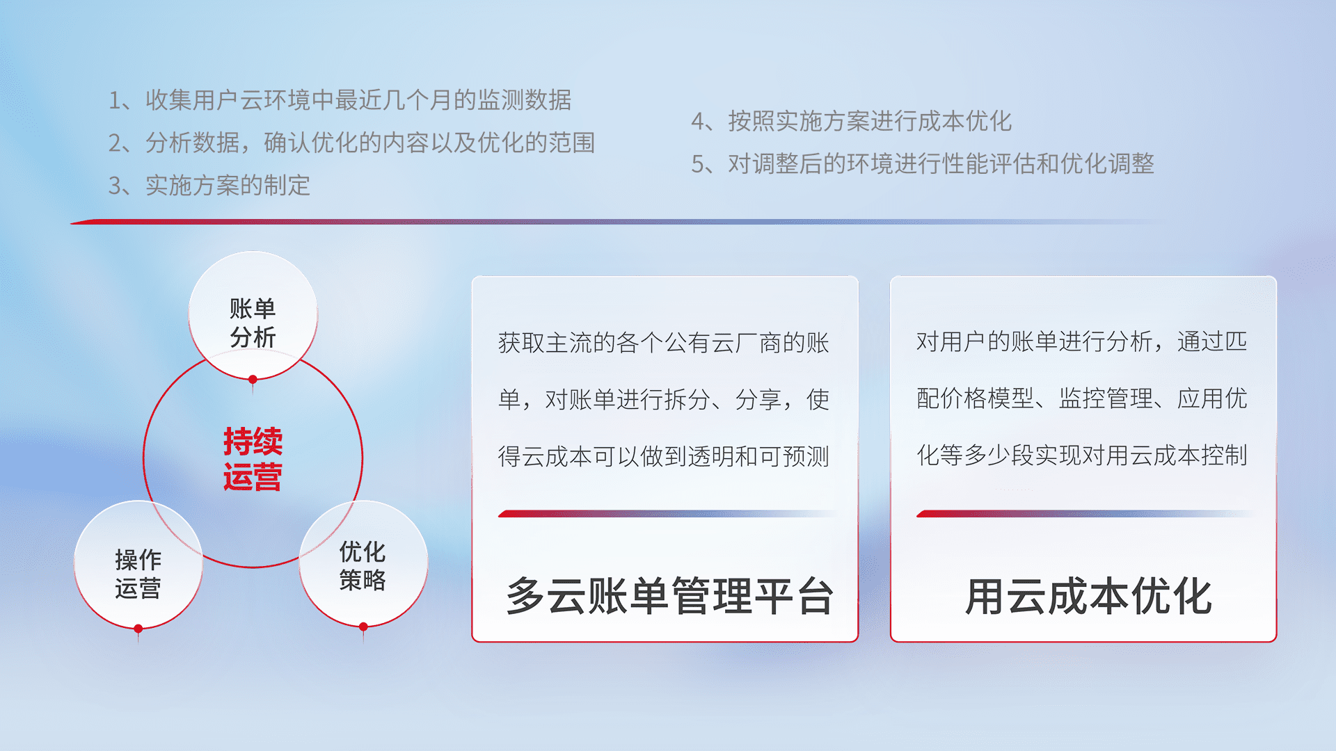 通过多云纳管,,以统一的资源数据模型把客户的云资源进行抽象和封装,,,进而实现对多云资源的统一操作,,,保障云资源管理的可靠性、、稳定性与可用性。。量身定制化运维内容,,配置、、开发运维、、补丁管理、、备份、、、、监控、、认证和访问管理、、审计和日常巡检等,,保障在用云过程中的可靠度,,,稳定度以及高可用率。。